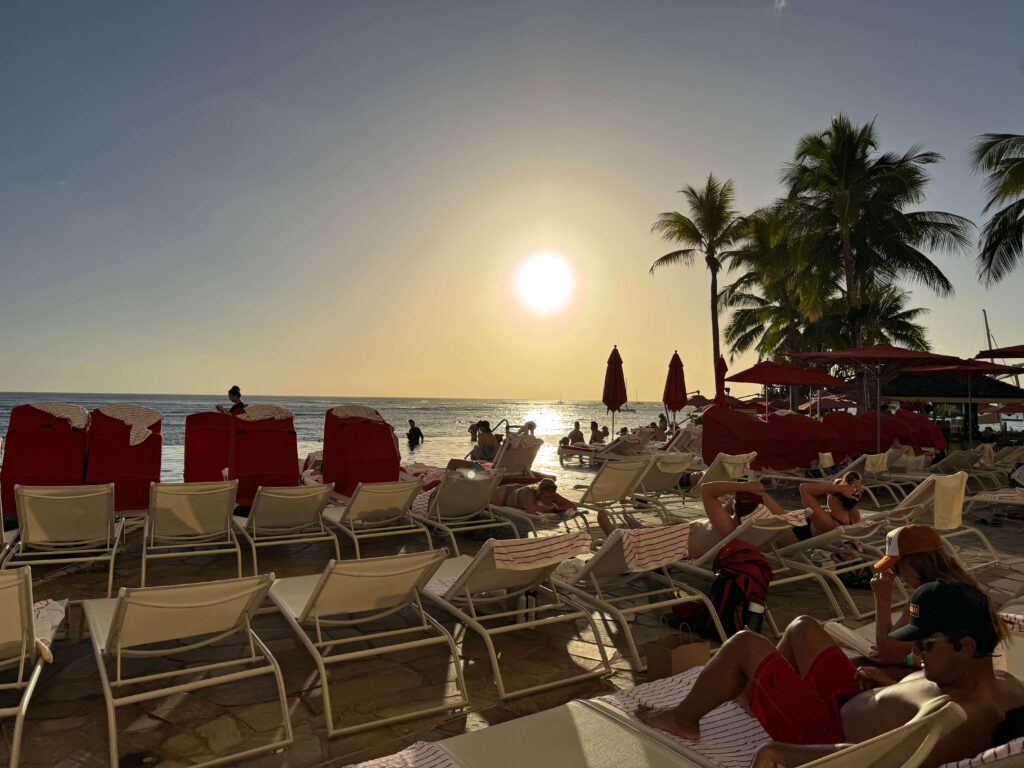 The Halekulani is Waikiki’s most refined luxury hotel – intimate, quiet, and directly on the beach. The signature orchid mosaic pool, beachfront dining at La Mer, and one of the highest staff-to-guest ratios on the island set it apart. No resort fee, which is rare at this level.